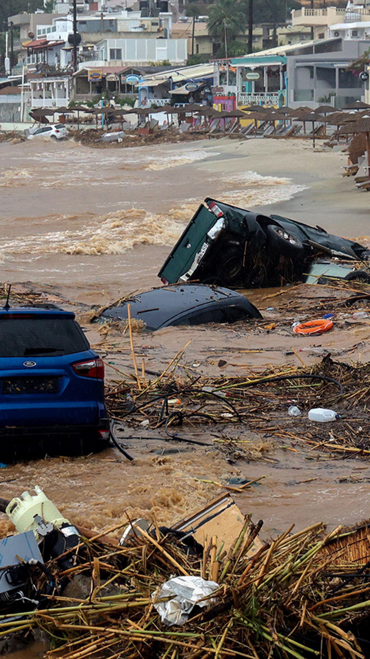 Hotels und Strandbars wurden verwüstet teilweise sind Dächer und Tavernen. Auch der Flugbetrieb ist gestört. Auf der Insel wurde ein 50-Jähriger von den Wassermassen mitgerissen und starb.